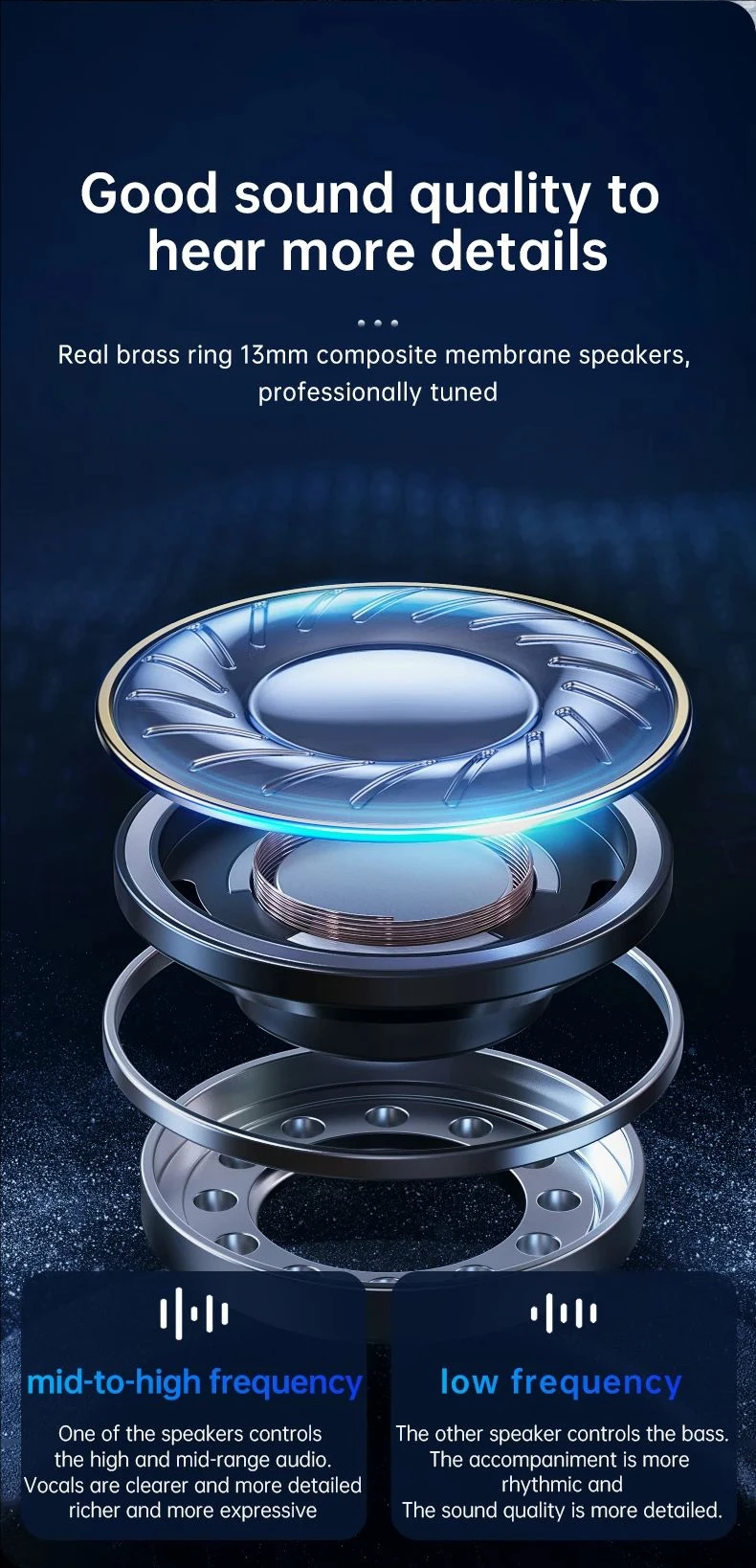 The Bluetooth earphones adopt a hanging ear design, and the composite diaphragm dynamic coil unit makes the sound full and thick, with natural hearing, restoring the authenticity of the audio and the dynamics of the sound. It feels like listening on site, providing you with realistic sound.