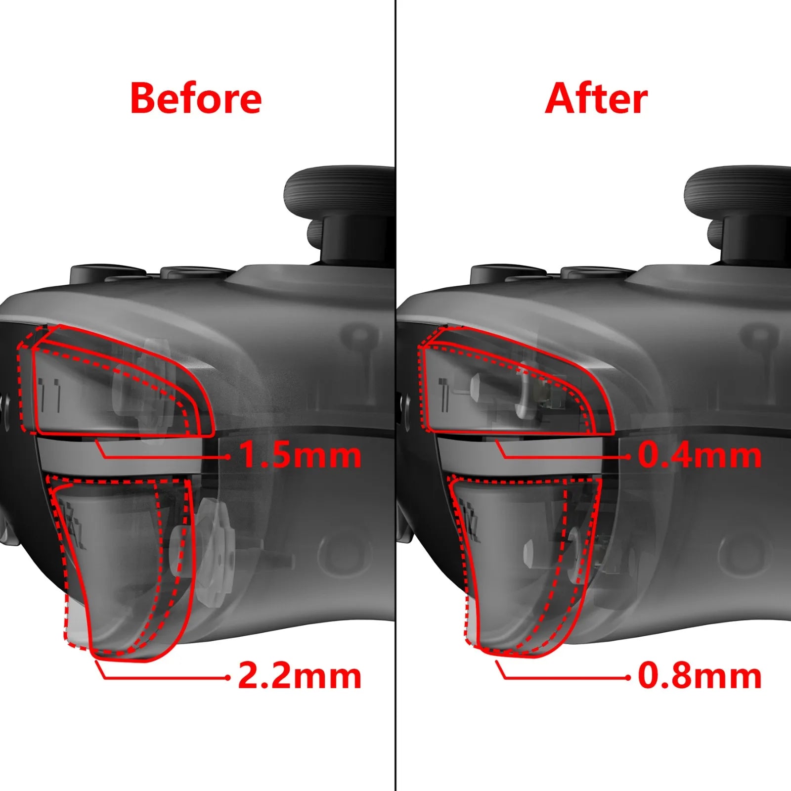 Just press down 0.4mm, and the function of L R can be triggered, saving nearly 4 times the distance.