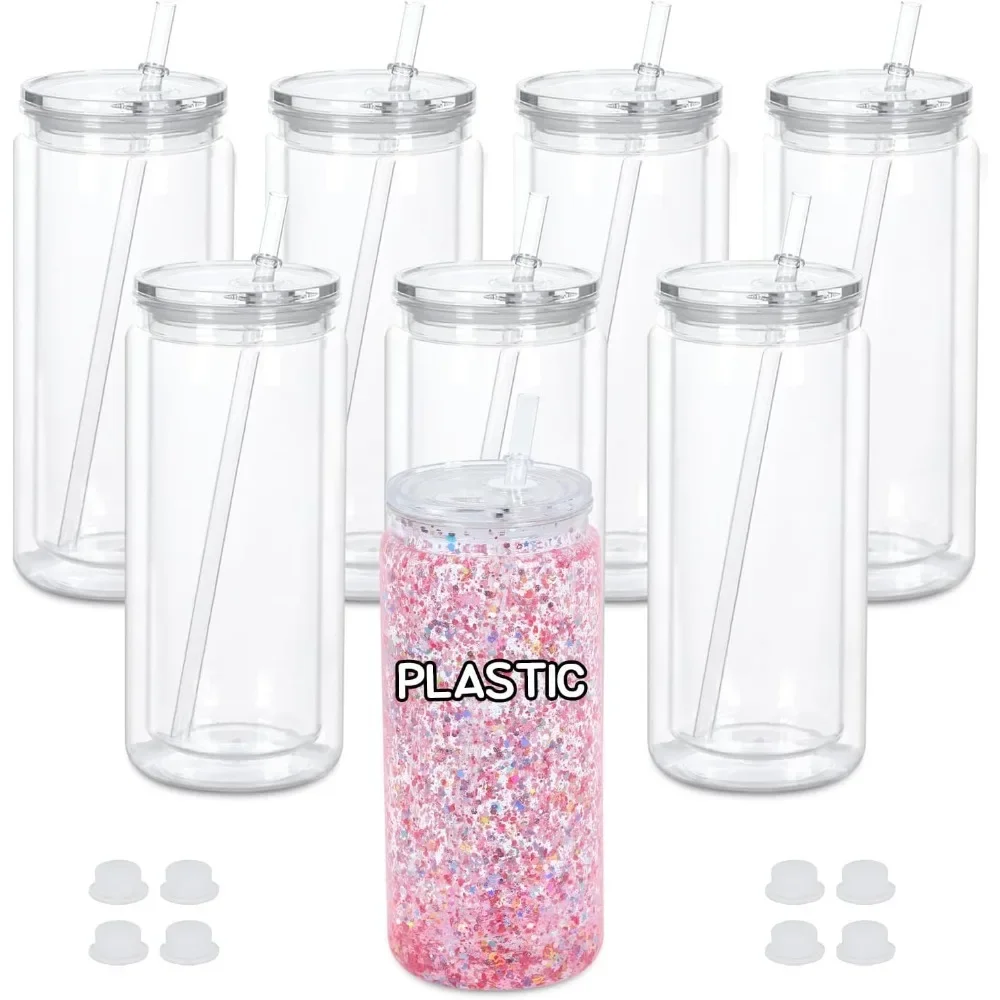 20 Oz Plastic Snowglobe Tumbler, 8 Pack Pre-Drilled Double Wall Acrylic Snow Globe Cup, Plastic Clear Cup for Snowglobe, with Clear Lid